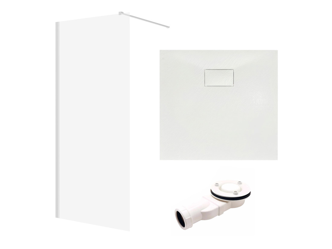 Entdecken Sie das ultimative Duschset für Ihr Badezimmer: Die Walk-In Dusche KETIL 80x195 cm in Kombination mit der bodenbündigen Duschwanne Quadratisch VIDAR 80x80x3,2 cm Weiß Steinoptik.