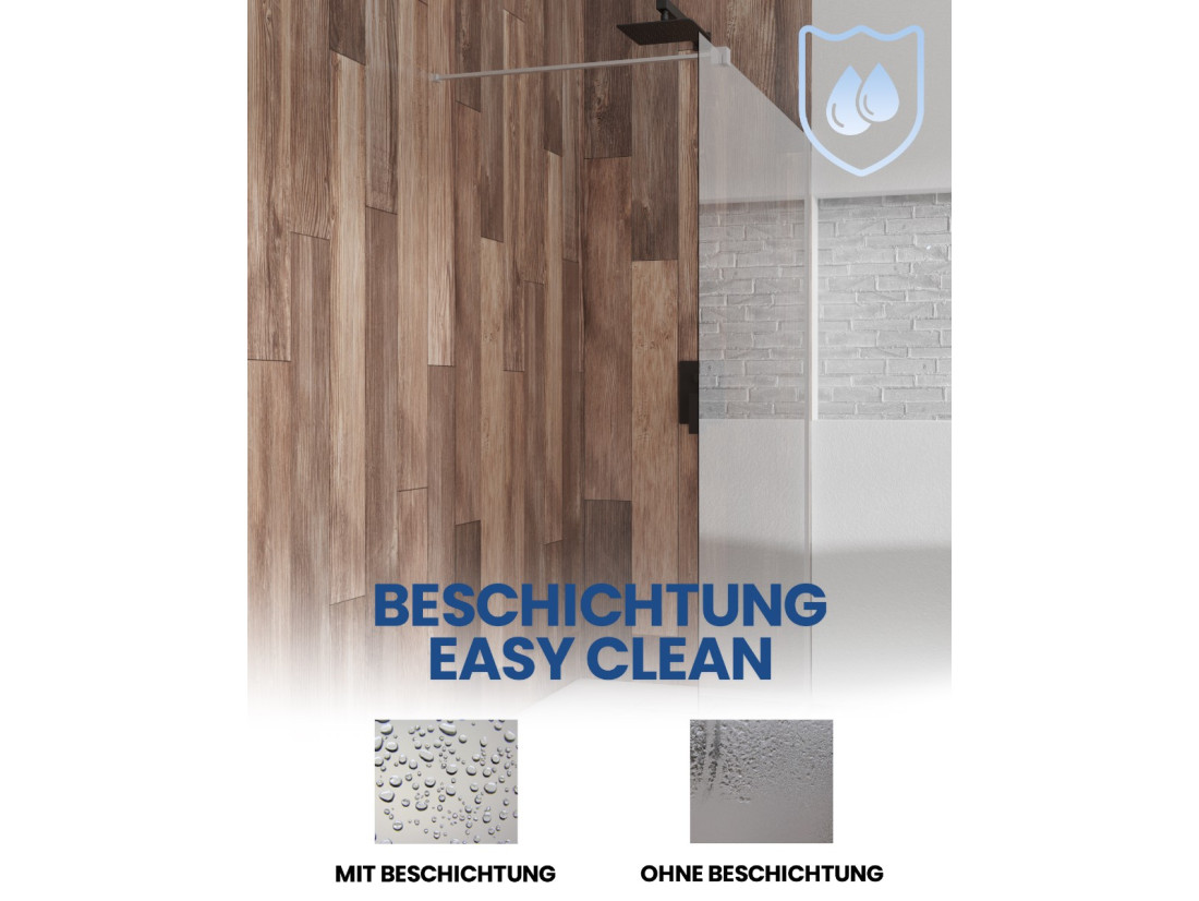 Die Glaswand bietet maximale Anpassungsfähigkeit für Ihren individuellen Duschraum. Mit gehärtetem 6-mm-Sicherheitsglas und der einzigartigen Nano Clean-Beschichtung erleben Sie Langlebigkeit, Sicherheit und einfache Reinigung. Die Nano Clean-Beschichtung sorgt dafür, dass Wassertropfen nicht an der Glasoberfläche haften bleiben und keine charakteristischen Ablagerungen hinterlassen.