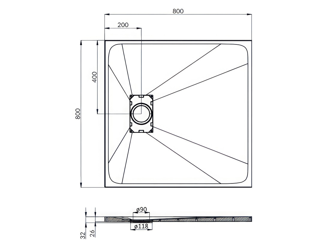 Das Duschbecken ist mit einem hochwertigen Ablauf mit einem Durchmesser von ⌀ 90 ausgestattet, der eine hervorragende Leistung und effiziente Wasserabführung gewährleistet.