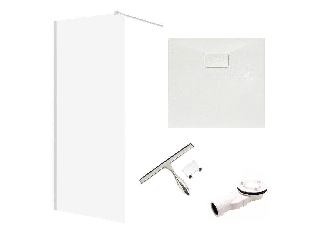 Entdecken Sie das ultimative Duschset für Ihr Badezimmer: Die Walk-In Dusche KETIL 90x195 cm in Kombination mit der bodenbündigen Duschwanne Quadratisch VIDAR 90x90x3,2 cm Weiß Steinoptik.